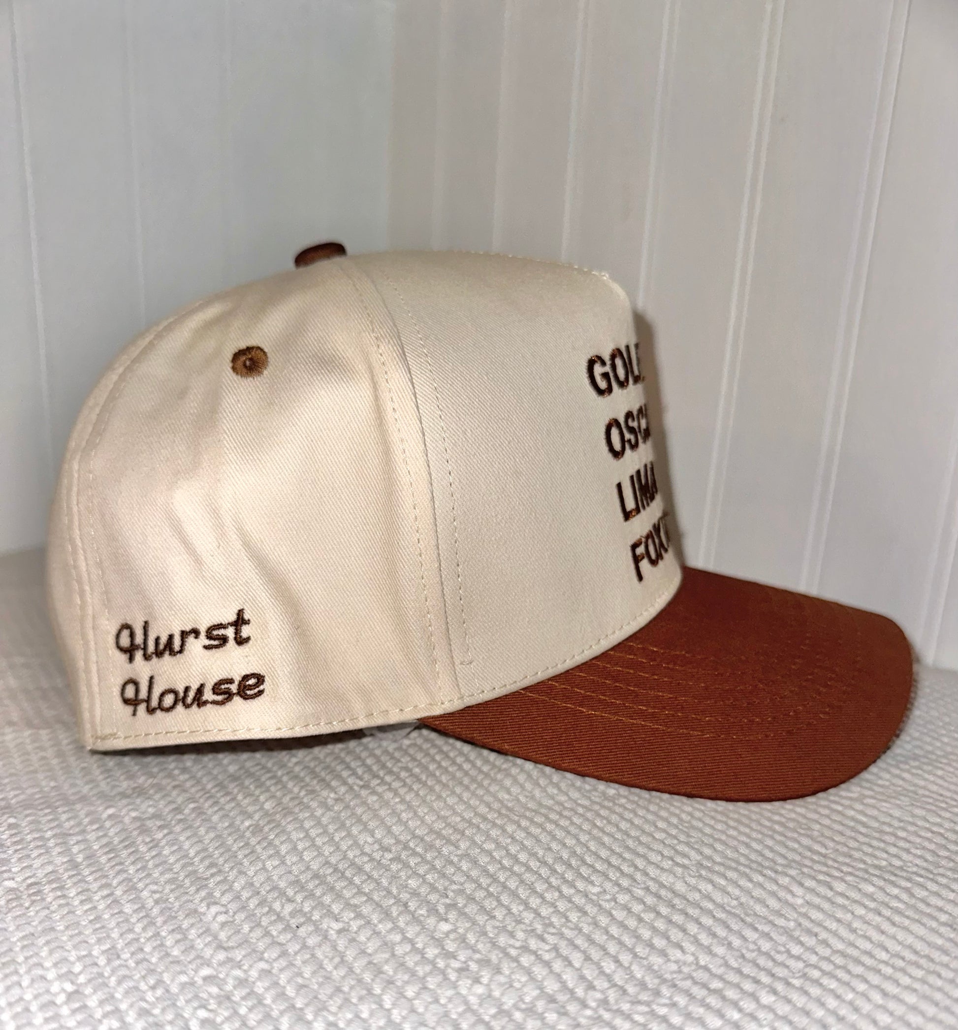 Hurst House Golf Company's 2 toned structured snap back. Phonetic alphabet spelling for 'GOLF'. Perfect for a day on and off the golf course. This hat is adjustable and 100 % cotton.